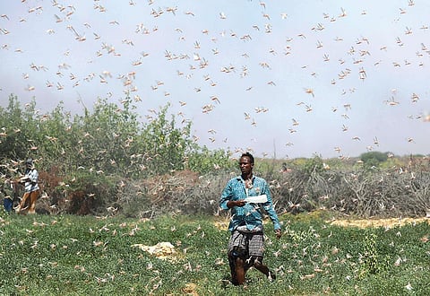 जून में टिड्डी दल ने कुछ घंटों में ही लाल सागर या अदन की खाड़ी को पार किया और हॉर्न ऑफ अफ्रीका में फैलने लगे। उन्होंने सोमालिया और इथियोपिया के उत्तर में आक्रमण किया, जहां अक्टूबर और नवंबर में बाढ़ ने रेगिस्तानी टिड्डों के लिए अनुकूल परिस्थतियां बना दीं। दिसंबर से केन्या पर टिड्टों का हमला इसी का परिणाम था।