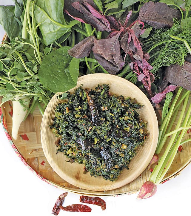 ओलोंग केमुकबास्तुकोंग, सरशोपोंग निंबोंग जोयांग, शलिंचिंग हिलमोचिकंचो पोतुकोंग शेलुकोङ्ग गुरुचींतोथा। वोन्तकिंग सुनीशोन्नोकोंग शिब्दीने खादोंती जे मनोबाह, प्रेतोतोंग नो चो जानती कार्तिक दिने कृष्णे चो वुते तिथौ॥ अर्थात, जो लोग कार्तिक मास के कृष्ण पक्ष की चतुर्दशी तिथि को 14 प्रकार के शाक खाते हैं, उन्हें प्रेतों की छाया छू भी नहीं सकती।