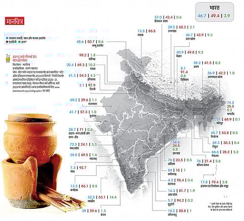 छत्तीसगढ़, ओडिशा और पश्चिम बंगाल ऐसे तीन राज्य हैं जहां के 75 प्रतिशत से अधिक ग्रामीण परिवार ईंधन के रूप में लकड़ी, उपले, पेड़ों की छाल व फसल अवशेषों का इस्तेमाल कर रहे हैं। देशभर के कम से कम 12 राज्य व केंद्र शासित प्रदेशों के 50 प्रतिशत से अधिक ग्रामीण परिवार इस प्रदूषणकारी ईंधन का उपयोग कर रहे हैं। चंडीगढ़, दिल्ली, तेलंगाना, पुदुचेरी गोवा और सिक्किम के ग्रामीण परिवारों की स्थिति इस मामले में सबसे बेहतर है। यहां के 10 प्रतिशत से कम ग्रामीण परिवार ही प्रदूषणकारी और स्वास्थ्य के लिए हानिकारक ईंधन का इस्तेमाल कर रहे हैं।
