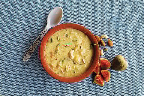 विधि: बादाम, काजू और पिस्ता को गरम पानी में भिगोकर पांच मिनट के लिए रख दें। अब दोनों को छीलकर बारीक काट लें। इसके बाद एक कड़ाही में घी डालकर सूजी को 2-3 मिनट तक भूनें। इसमें बारीक कटे बादाम, पिस्ता और काजू डालकर 2 मिनट तक और भूनें। इसके बाद इसमें दूध डालकर मिश्रण को गाढ़ा होने तक पकाएं। अब इसमें चीनी और केसर को डालकर अच्छी तरह पकाएं। बारीक कटे ताजे अंजीर के टुकड़े, इलाइची पाउडर और कद्दूकस किया हुआ मावा डालकर 3 मिनट तक पकाएं। बारीक कटे पिस्ता और बादाम से सजाकर परोसें। |