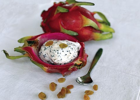 अब इलेक्ट्रिक बीटर से एक ही दिशा में घुमाते हुए हाई मोड पर 15 मिनट तक क्रीम को बीट करते रहें। जब क्रीम फूलकर दोगुना हो जाए तो इसमें पिसी हुई चीनी और वनीला एसेंस मिलाएं और 10 मिनट के लिए बीट करें और तैयार क्रीम को फ्रीजर में रख दें। अब ड्रैगन फ्रूट को बीच से काटकर उसका गूदा एक चम्मच से निकाल लें और इसे छोटे-छोटे टुकड़ों में काट लें। केले को भी छीलकर छोटे-छोटे टुकड़ों में काट लें। अब क्रीम वाले भगोने में ड्रैगन फ्रूट और केले के टुकड़ों को डालकर इलेक्ट्रिक बीटर से 10 मिनट के लिए बीट करें। अब एक कंटेनर में मिश्रण को डालकर 2 घंटे के लिए फ्रीज करें। फिर इसे फ्रीजर से निकालकर हैंड मिक्सर से हिलाएं, जिससे आइसक्रीम पर जमी बर्फ टूट जाए। अब कंटेनर को फिर से 6-8 घंटे के लिए फ्रीज करें। आइस स्कूप से निकालकर और किशमिश से सजाकर परोसें। |