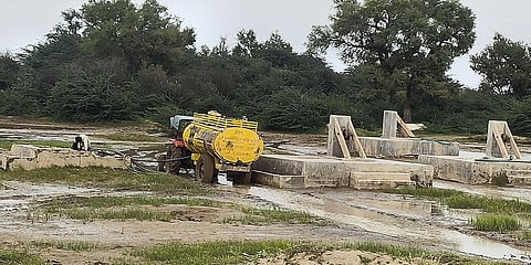 बाड़मेर का गांव रामसर, जहां मई-जून में सामान्य से तीन गुना अधिक बारिश (सामान्य वर्षा 115.2 मिमी और इस बार हुई 340.6 मिमी) ने यहां की बेरियों (छोटी कुंइयां) को इतना भर दिया कि इनमें पाइप डाल कर टैंकरों में पानी भर कर सप्लाई की जा रही है।
